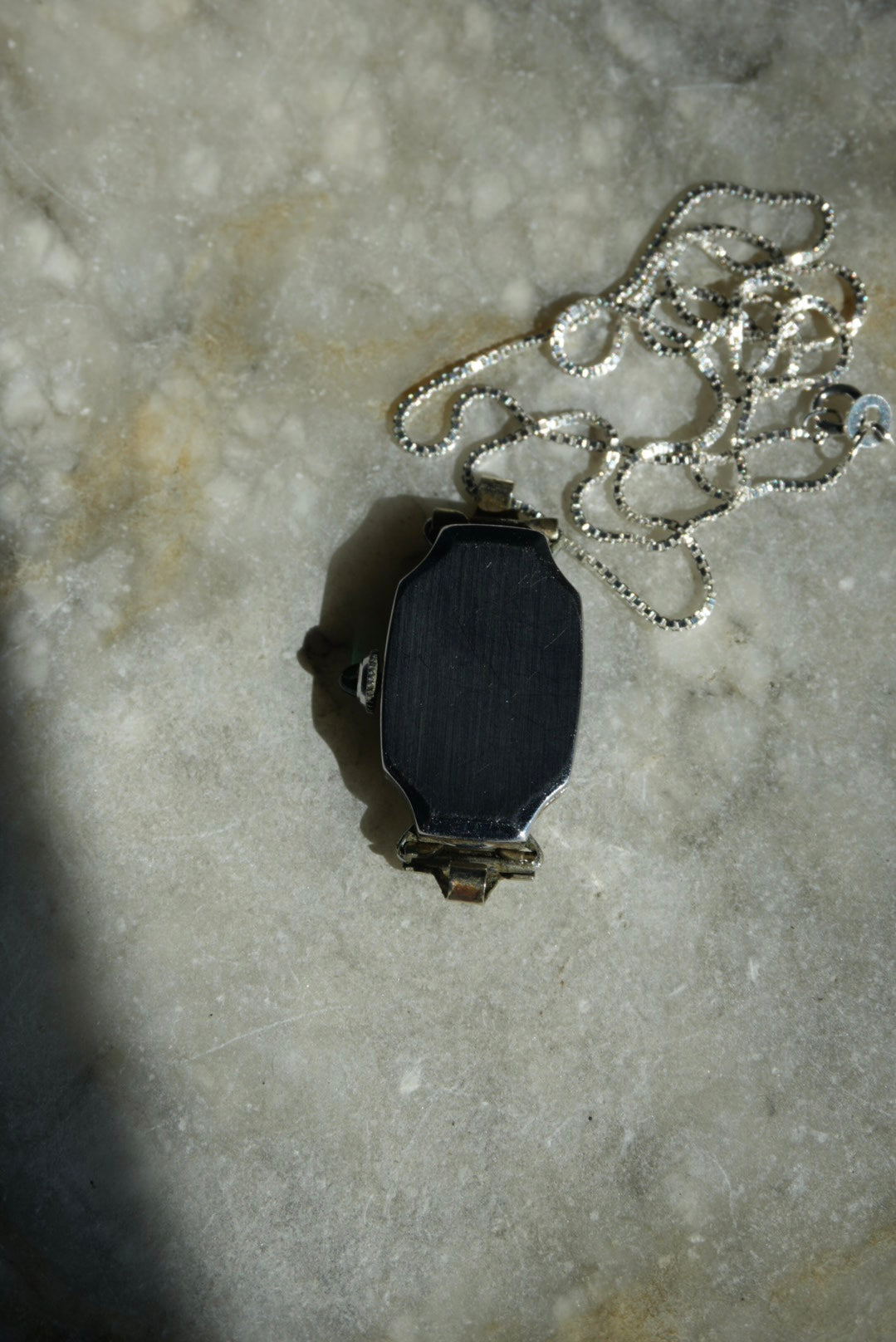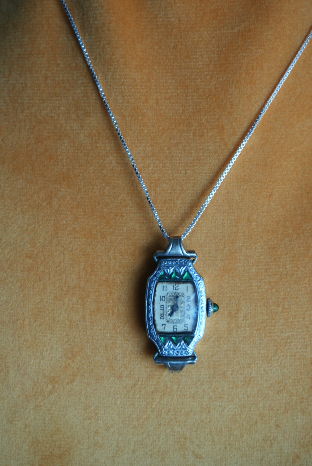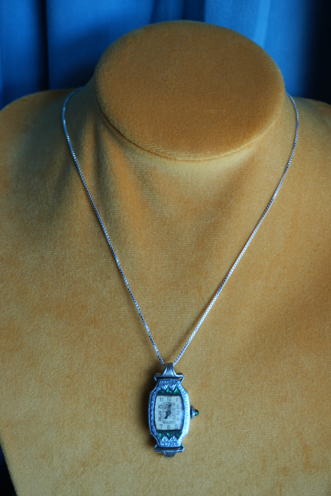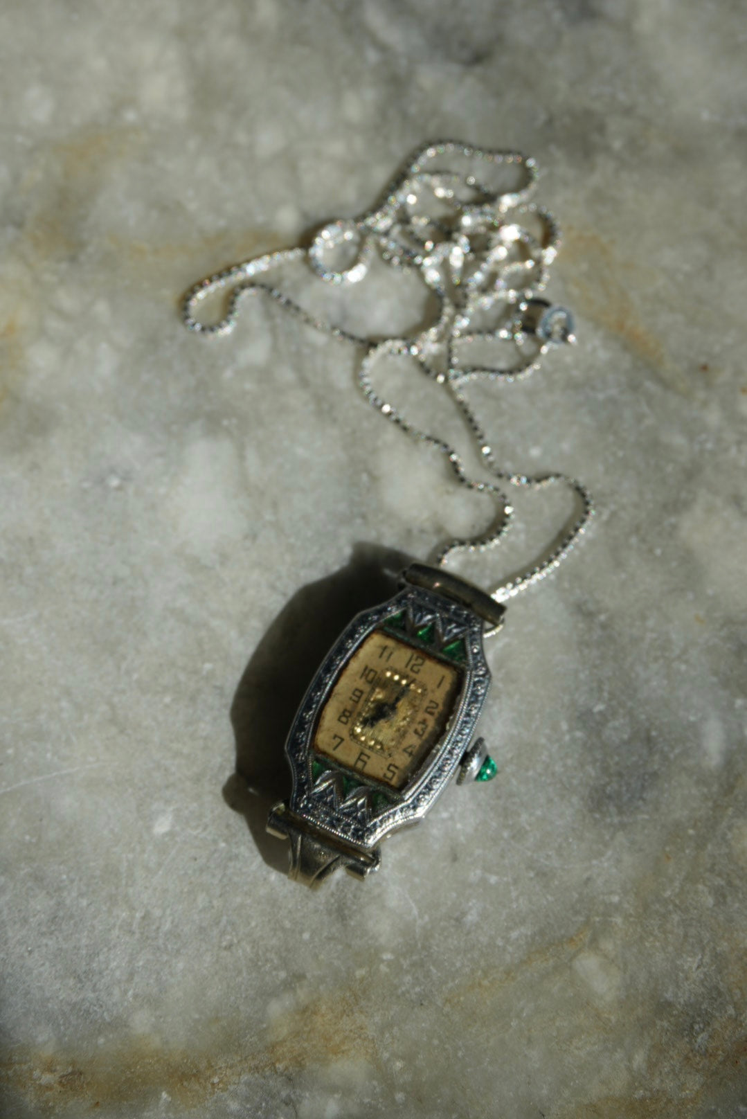 Antique Bulova white gold filled time piece does no function, on an 18” length sterling chain. Condition 6/10