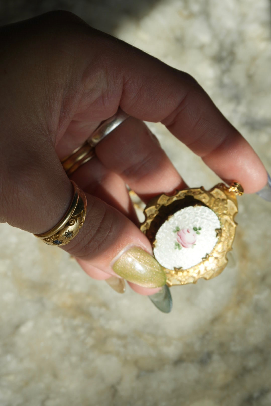 18-20” length vermeil chain and 2” tall goldtone pendant with hand painted enamel flower with secret locket !!
