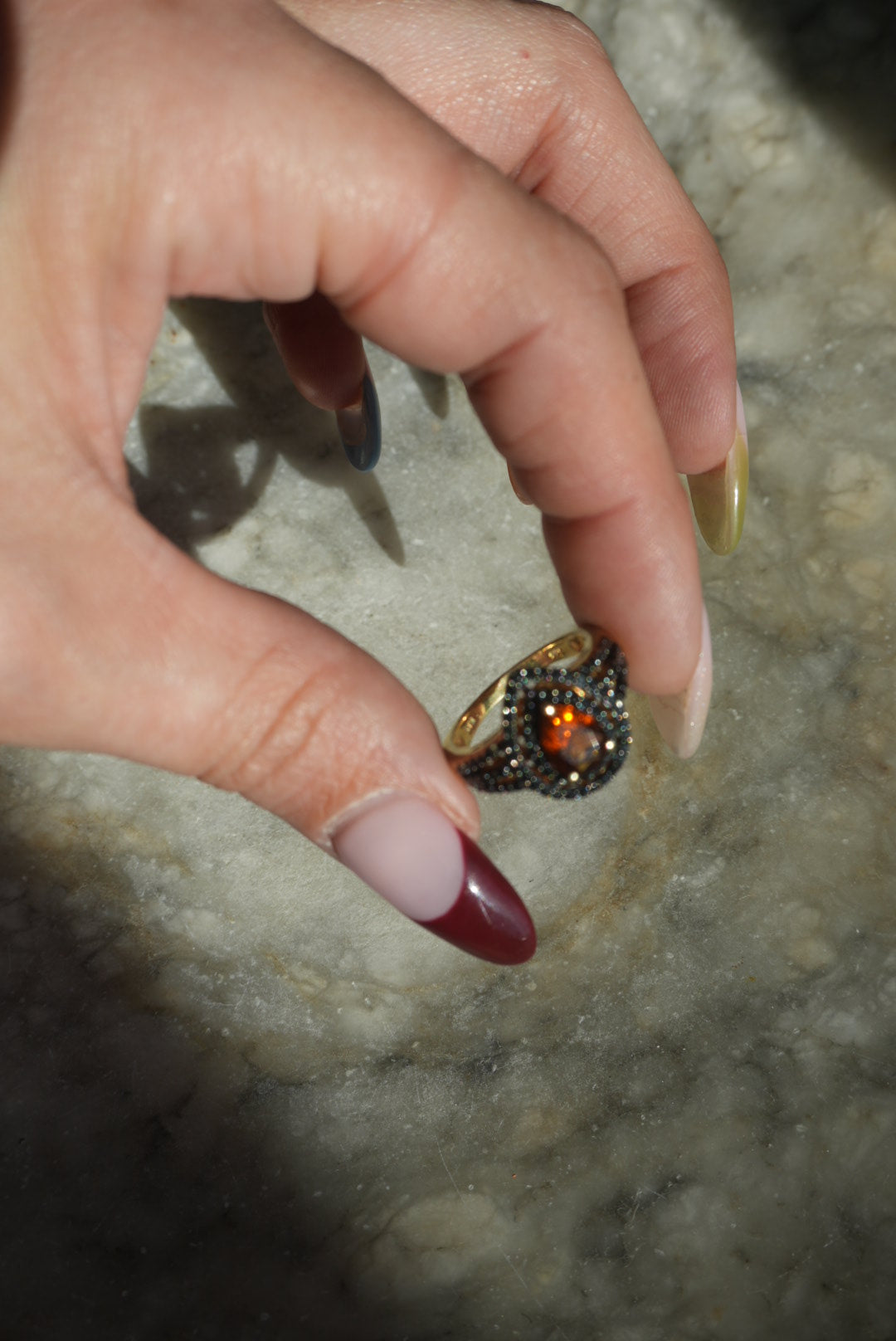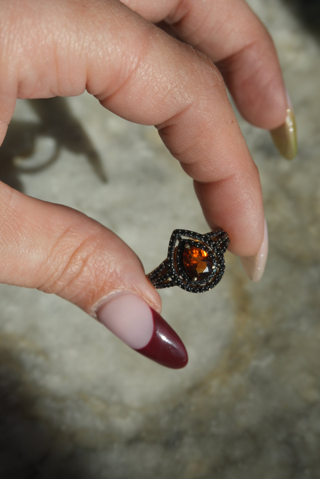Size 7.5 gold vermeil with orange spinel pear and black onyx pave