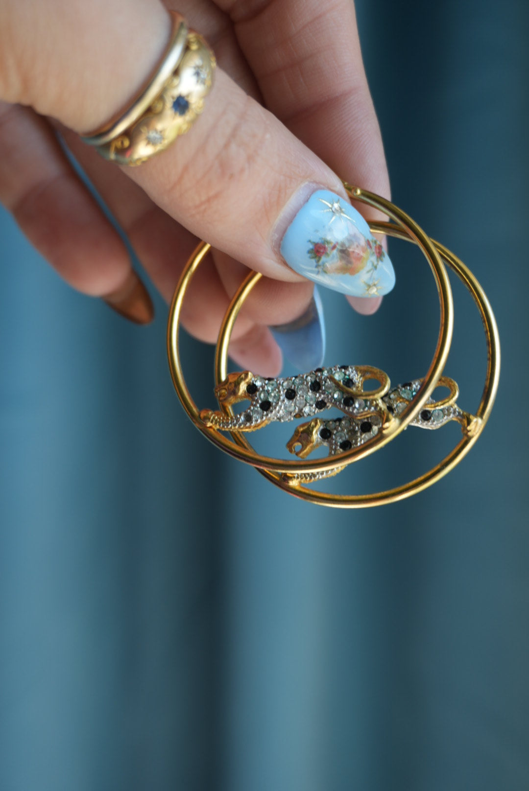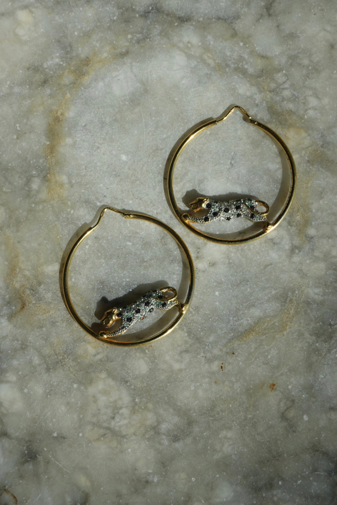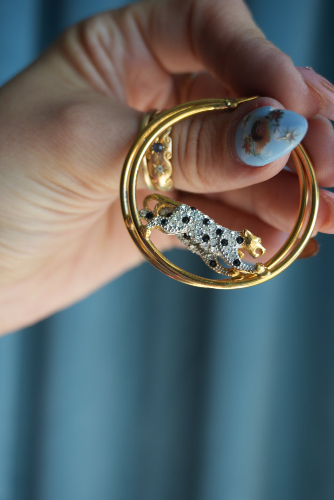 2” tall gold vermeil panther hoop with pave rhinestones and design on both sides. A couple are missing- very subtle, condition 7/10