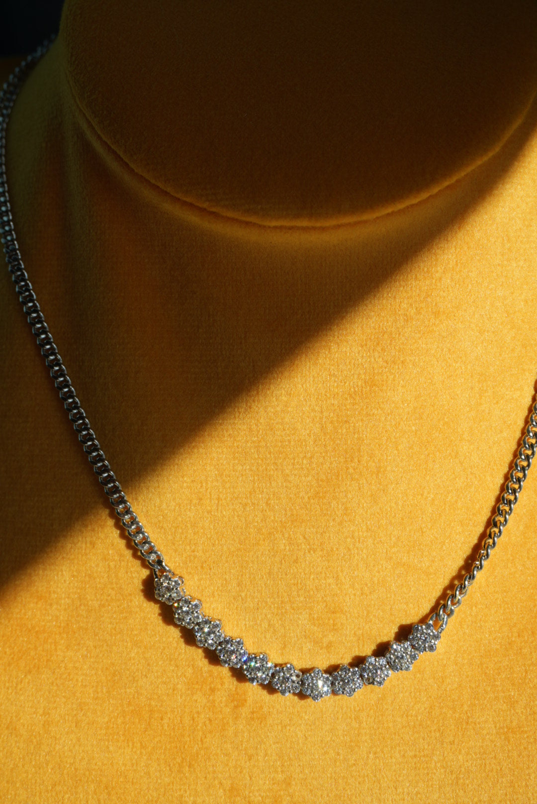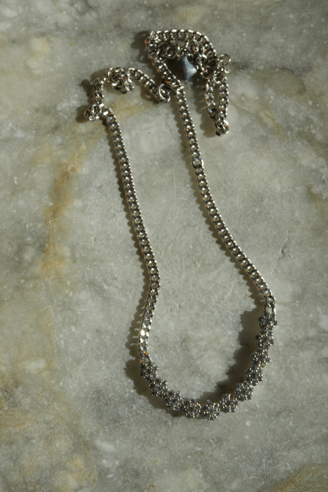 14-16 inch length sterling silver necklace with bright flower set stones! NOTE: condition 5/10, two tiny stones are missing from settings, sold as pictured, still so cute and priced accordingly