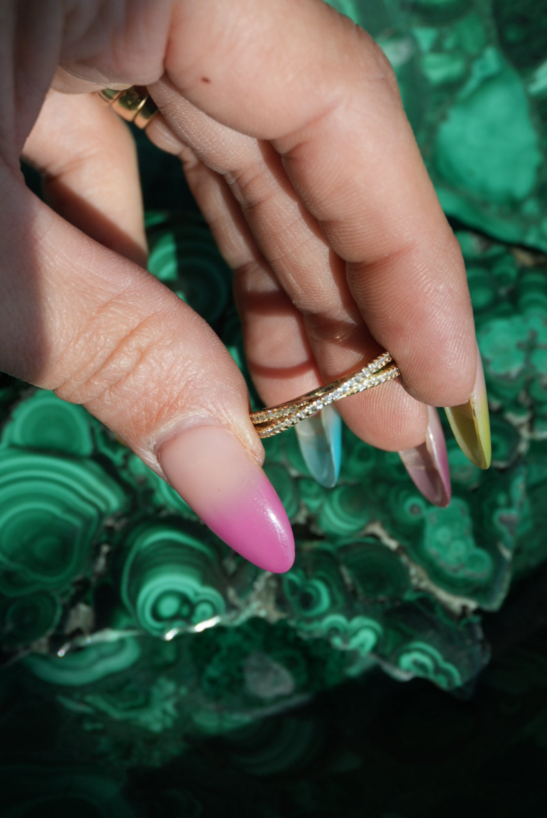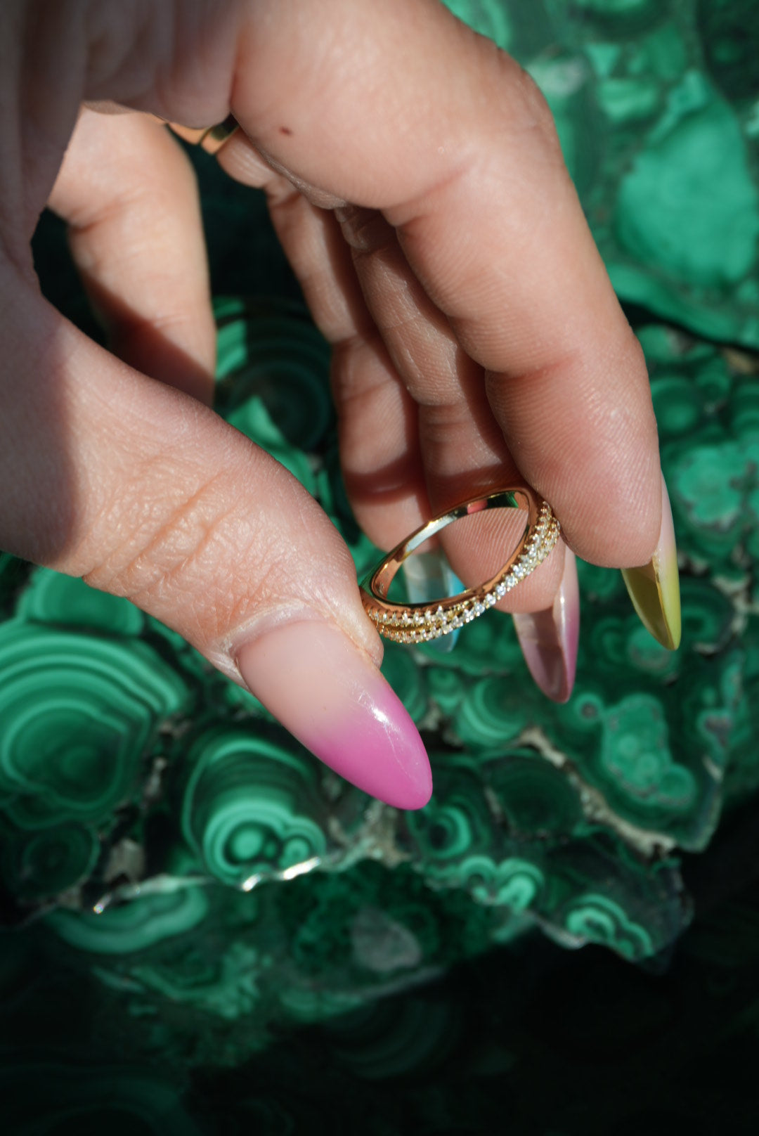 Crossover band with top half pave glass stones size 6