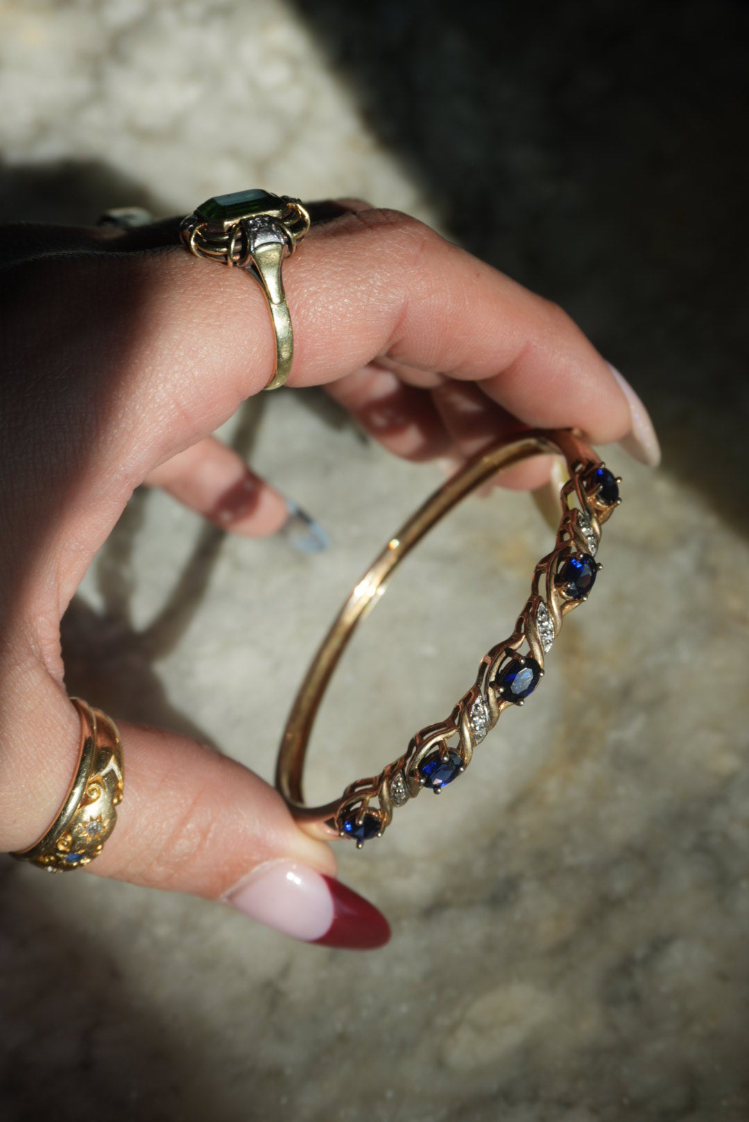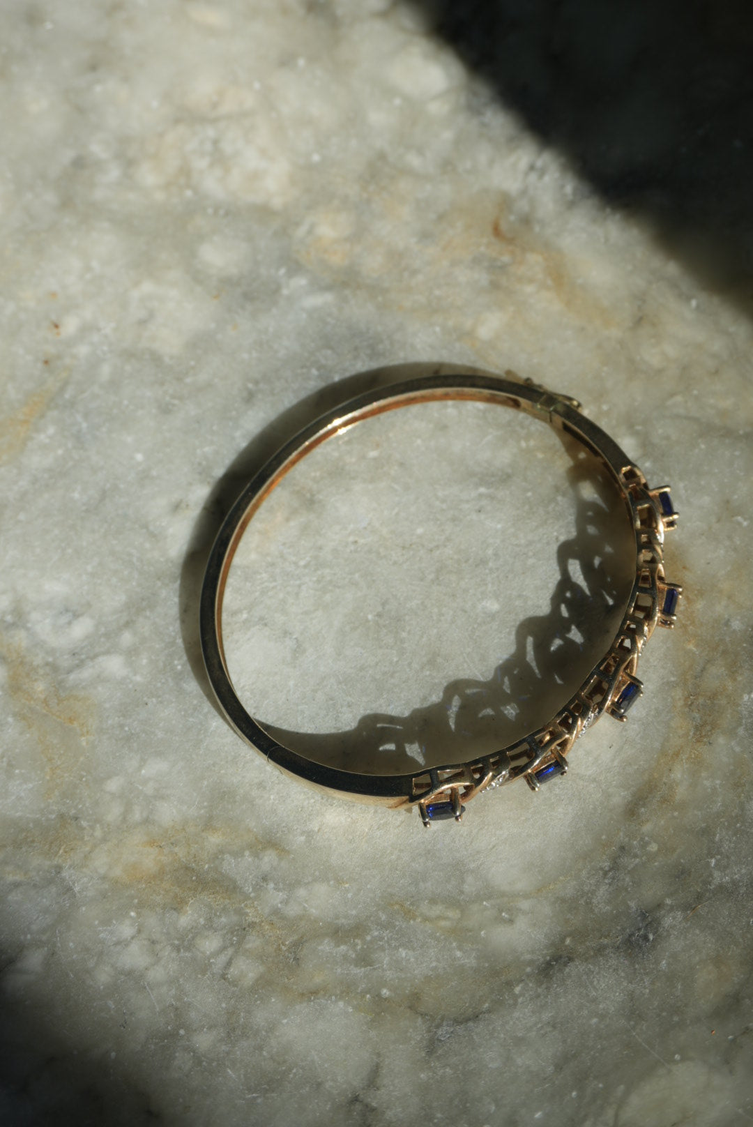 2.5 inch wide bangle bracelet with 5 blue sapphire stones
