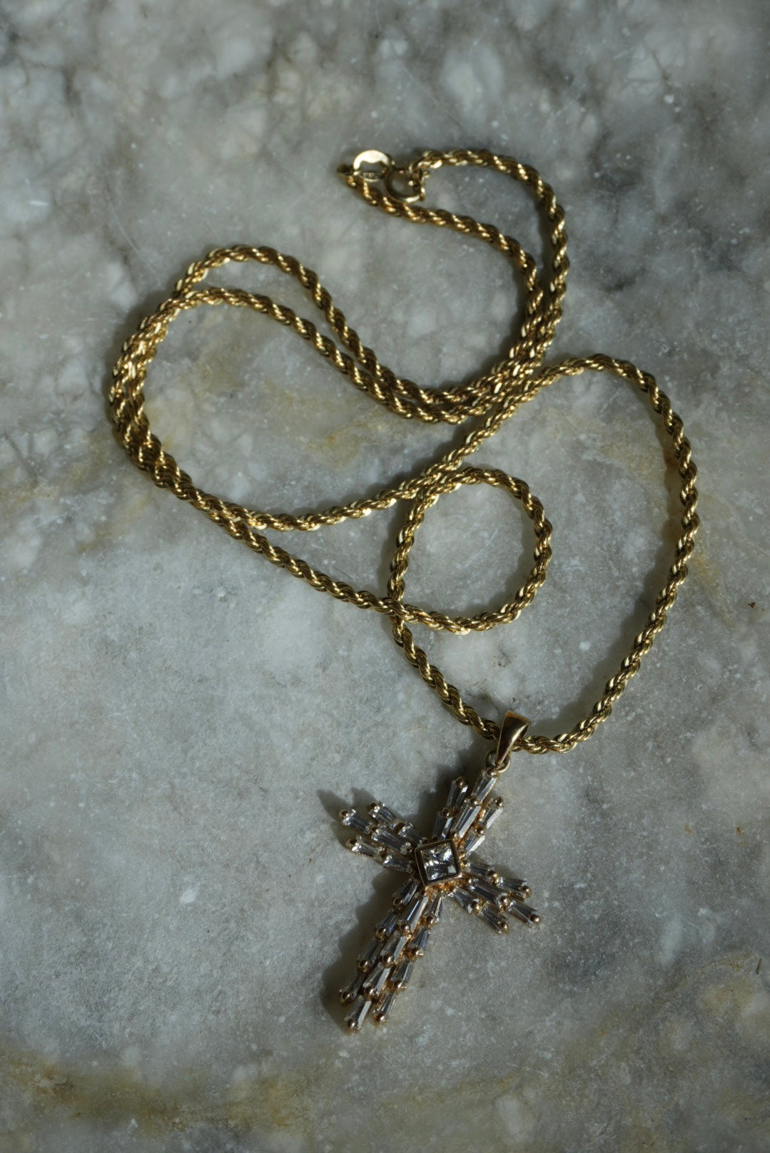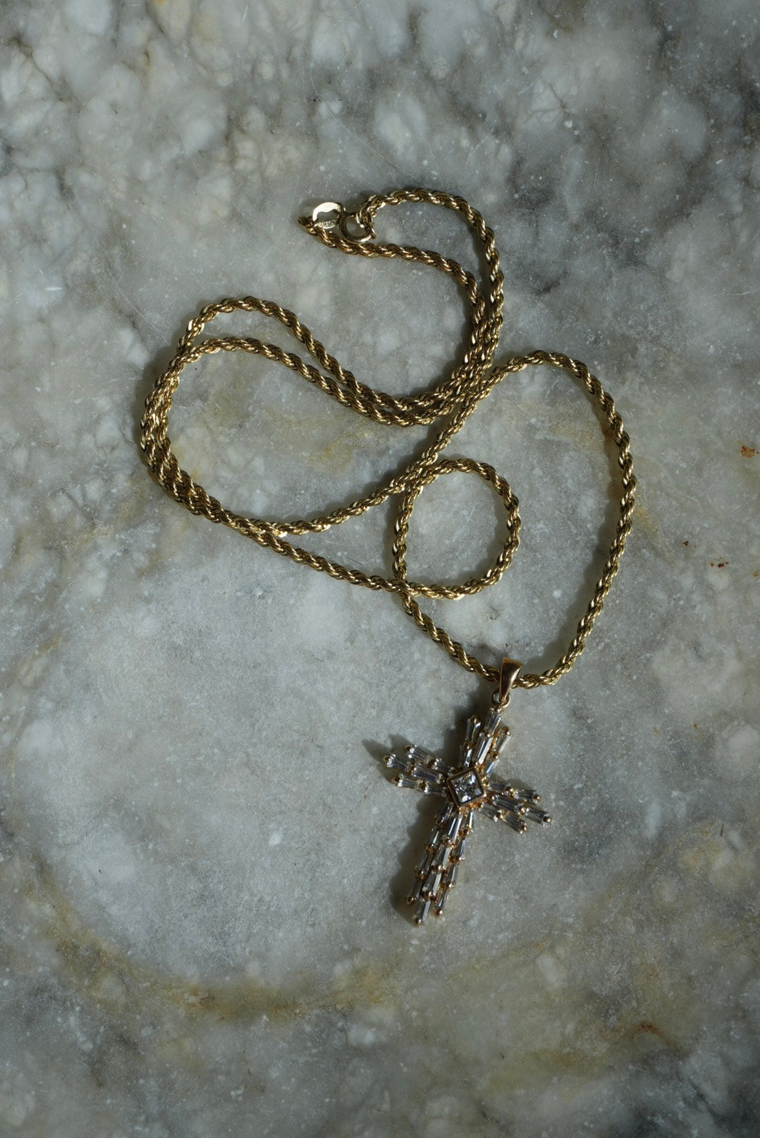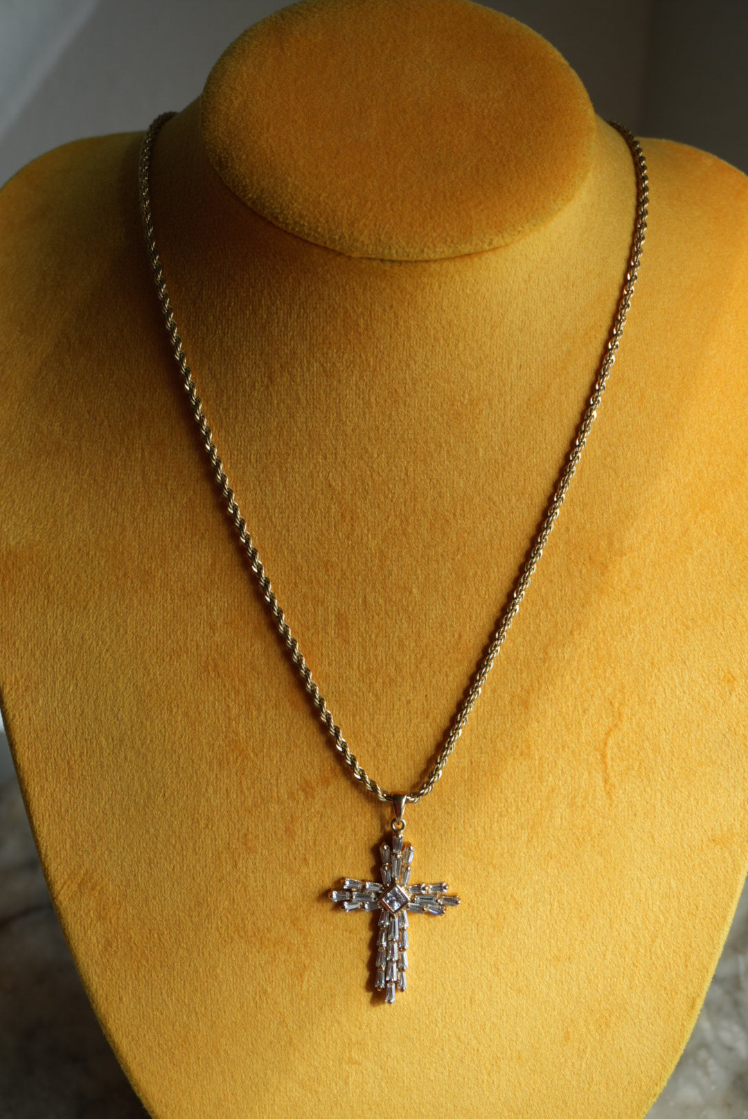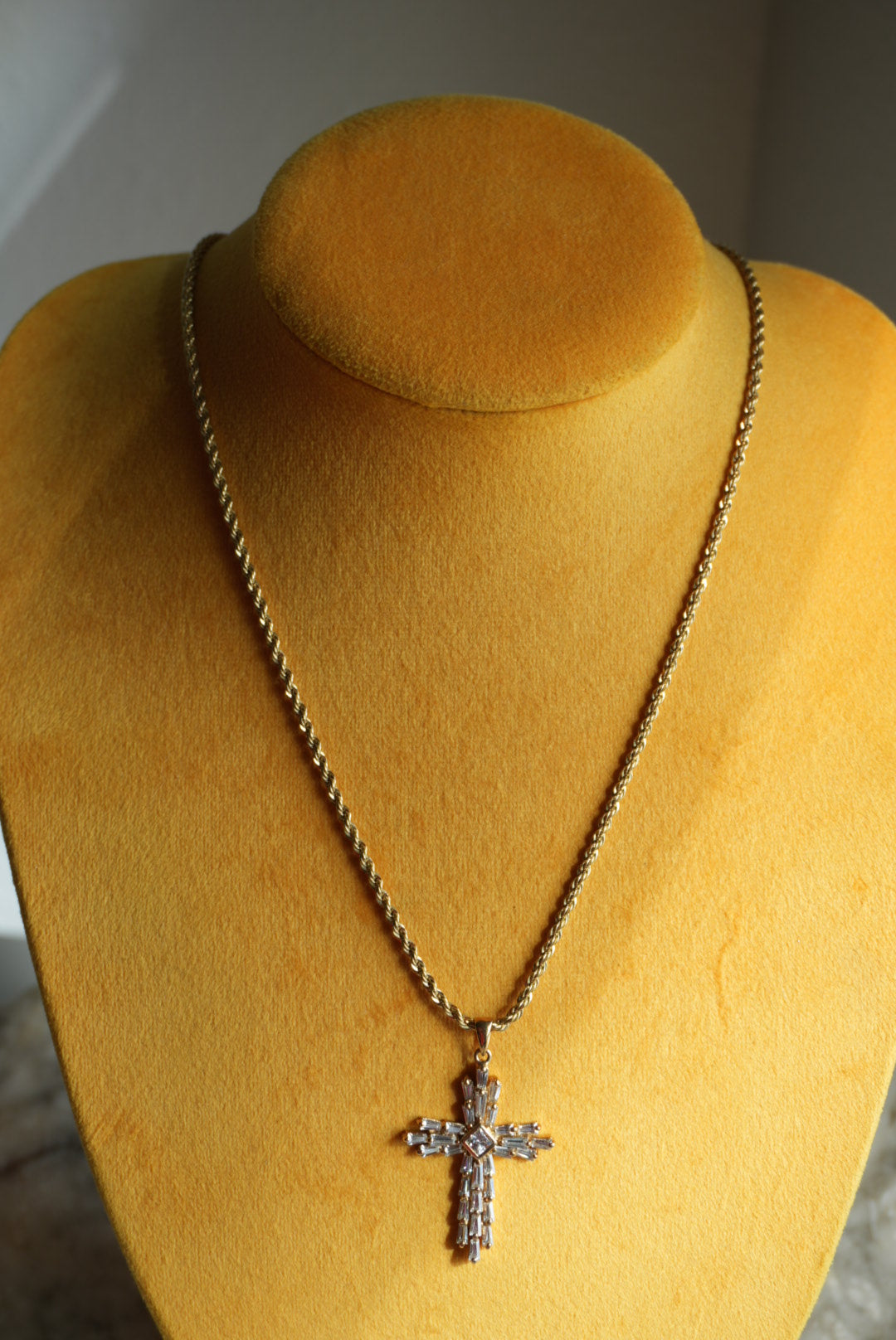 20” vermeil rope chain with vermeil cross with glass stones. 1.5” tall cross