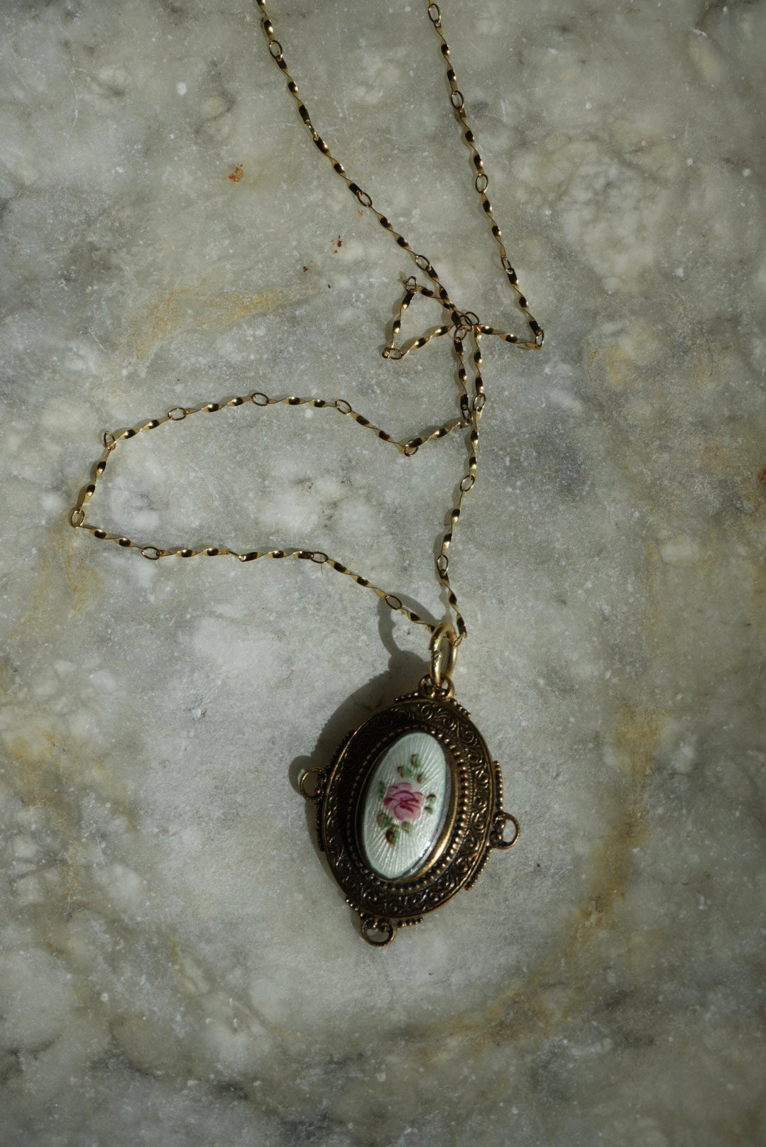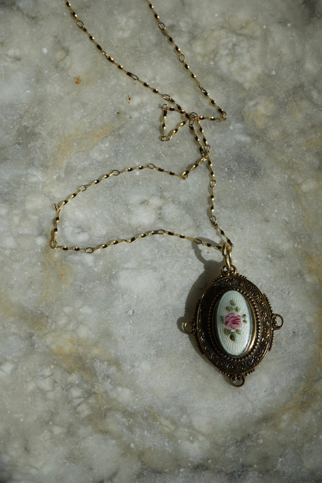 23” length vermeil chain with large plated costume pendant 1.75 inch tall with hand painted rose