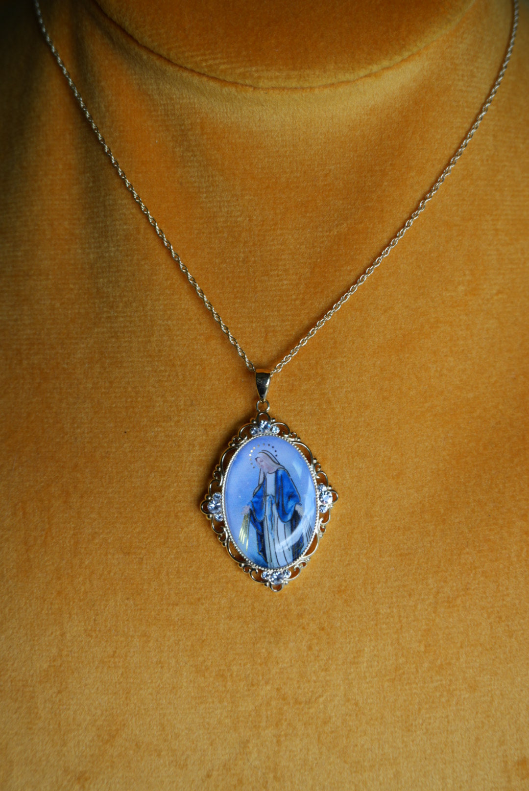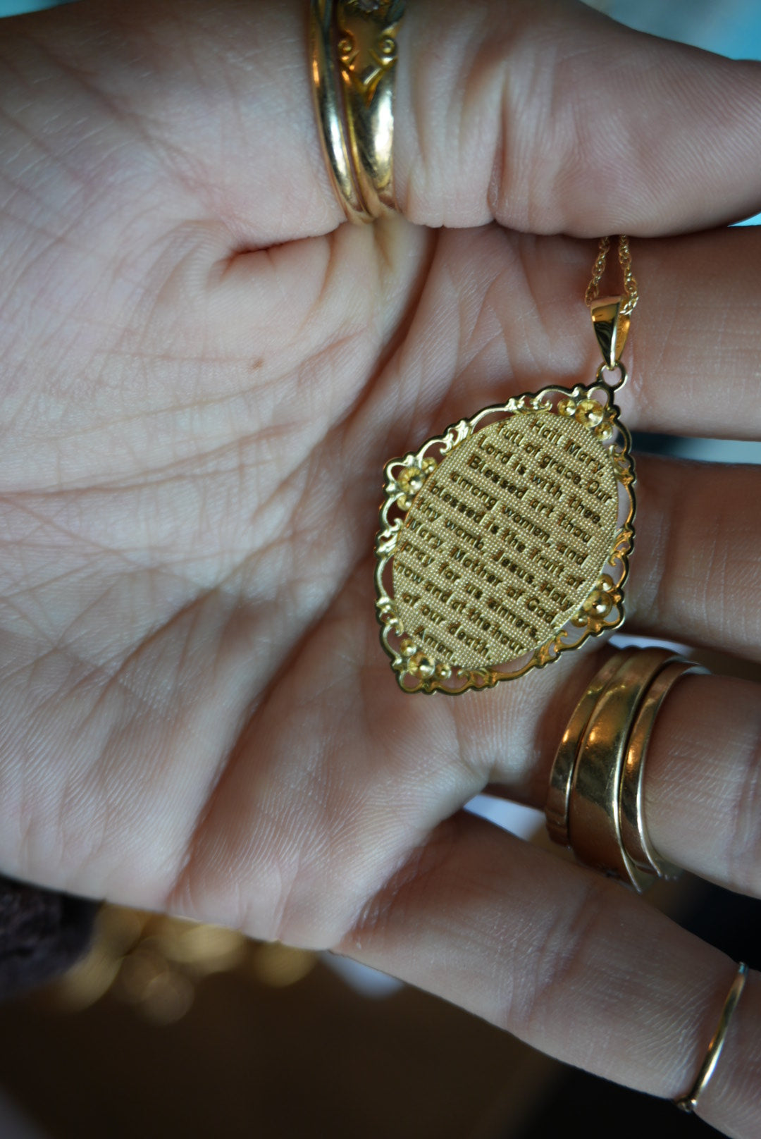 Gold vermeil 18” length chain with 1.5 inch tall Hail Mary charm with prayer on back