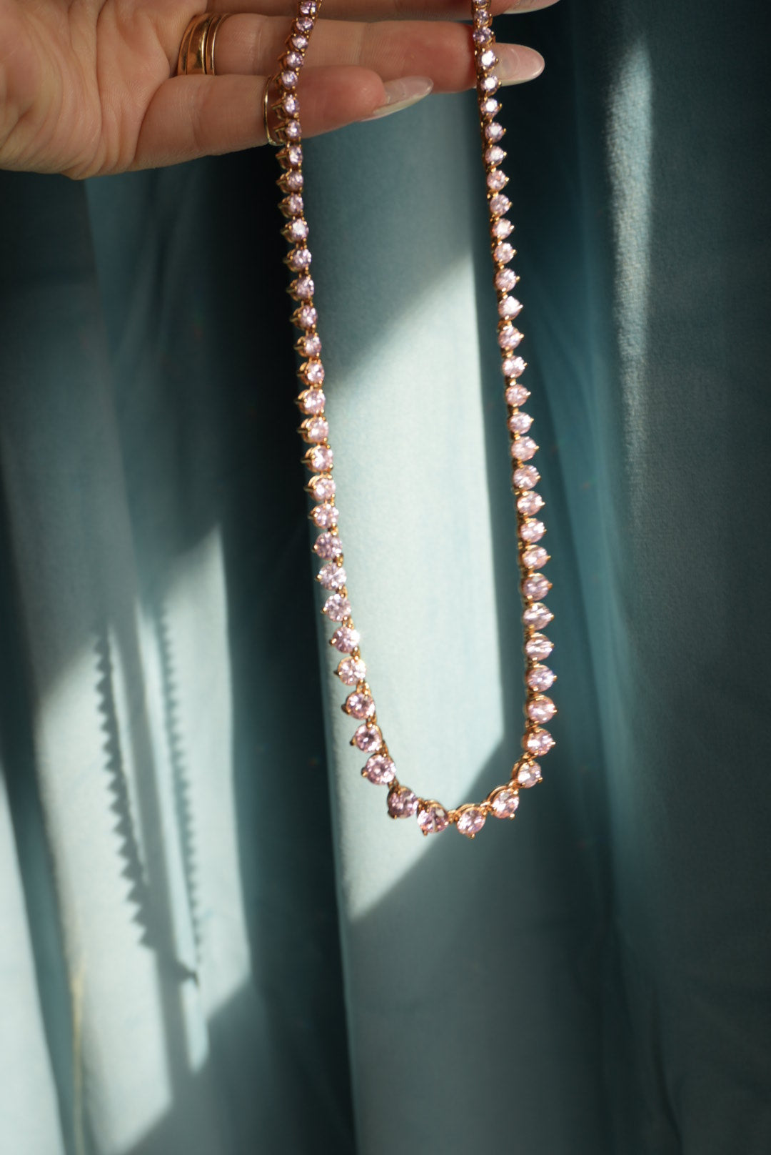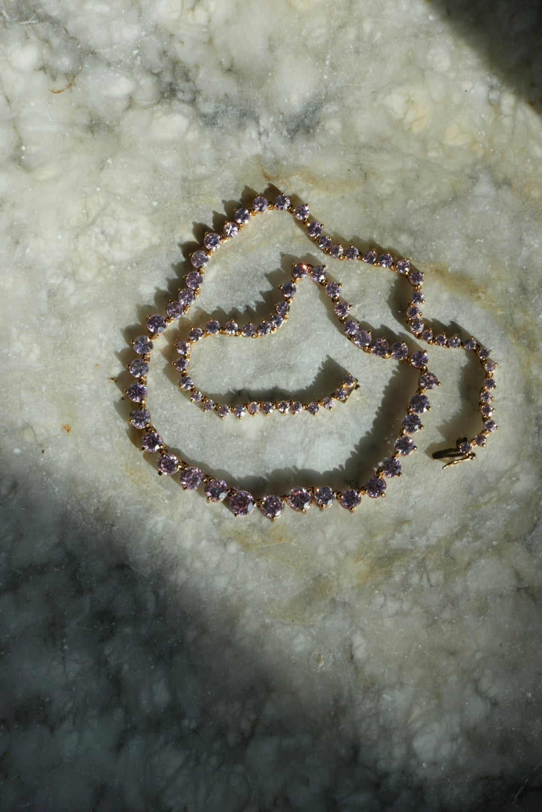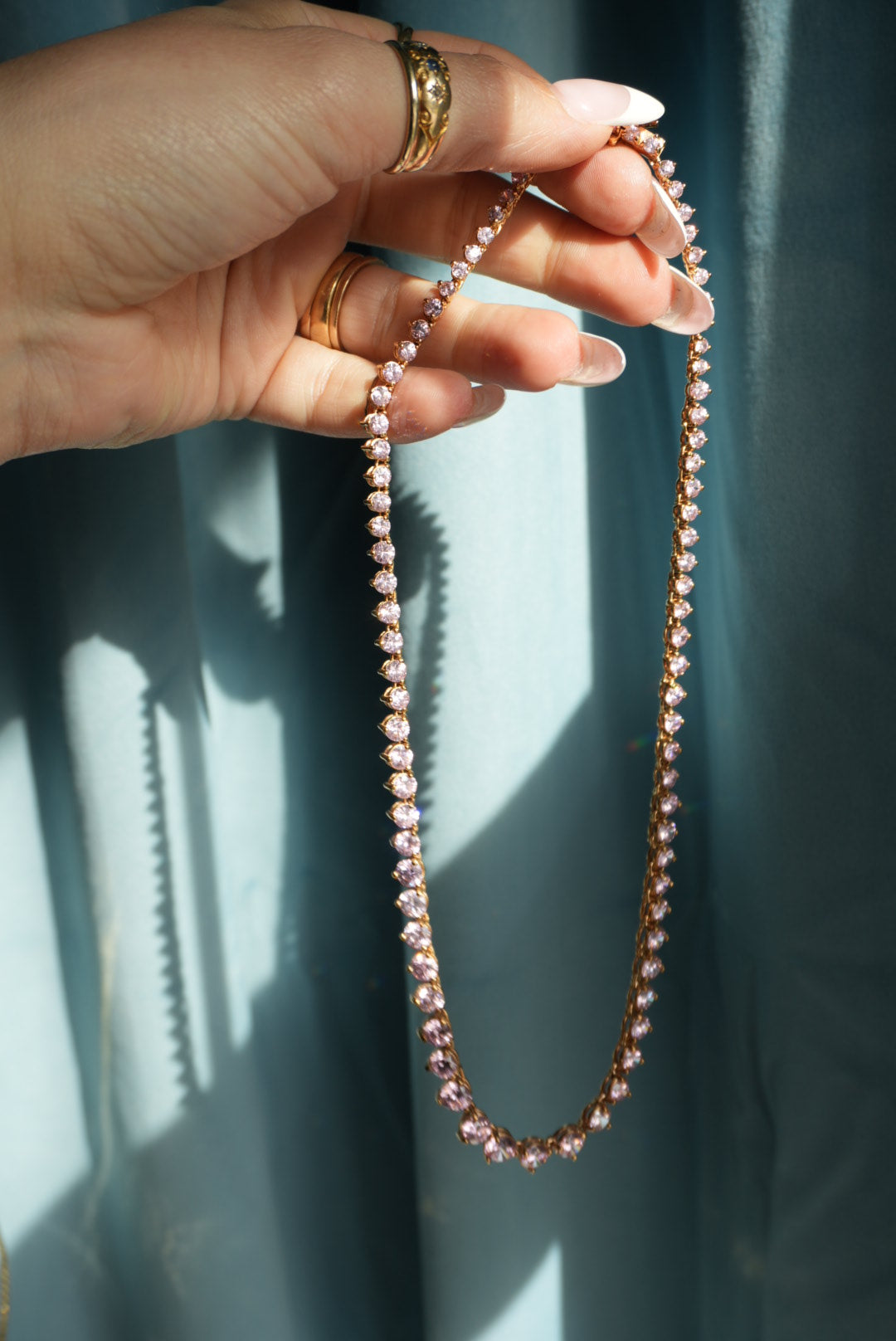 17” length gold vermeil tennis necklace with pink glass stones