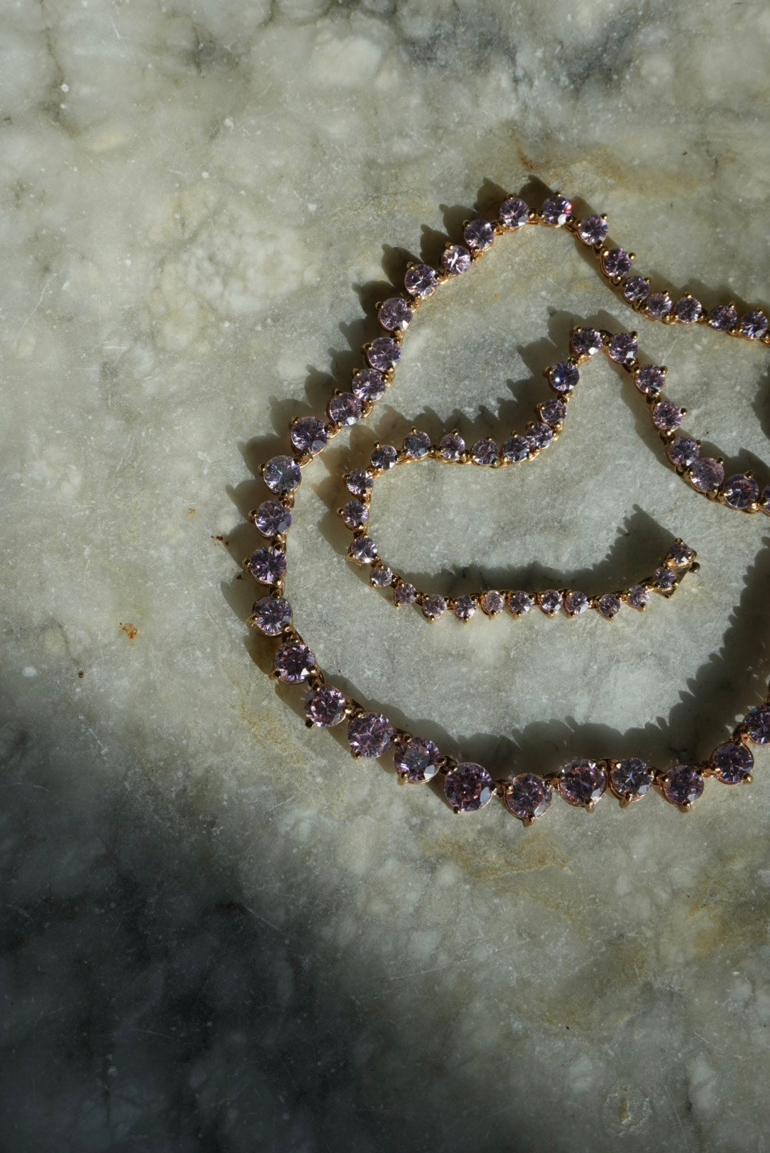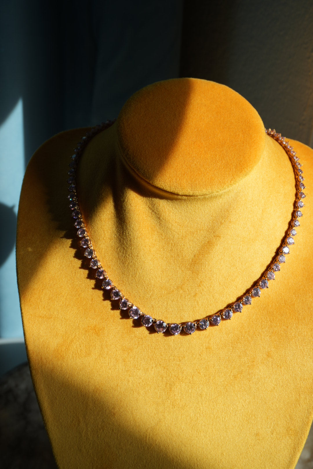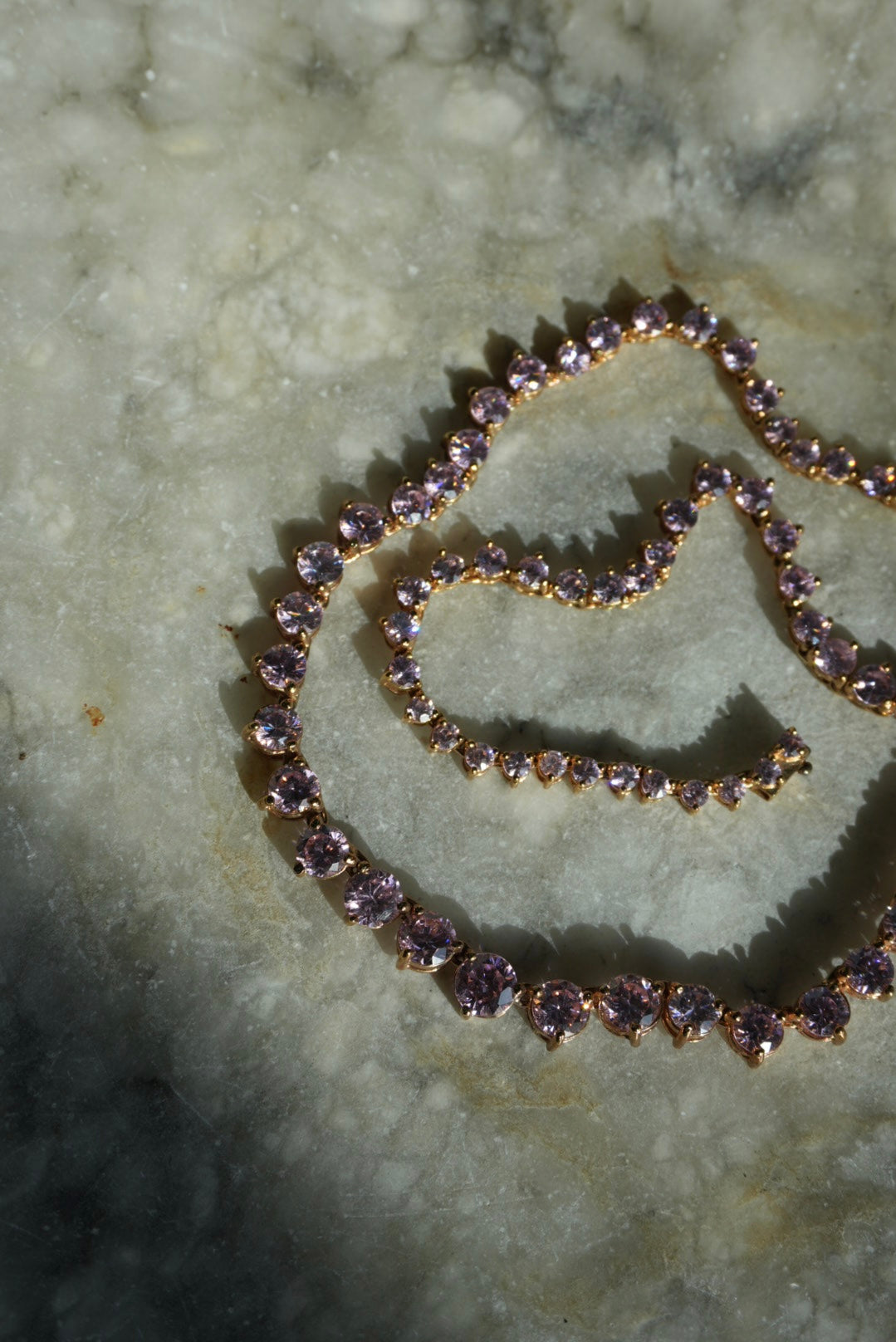 17” length gold vermeil tennis necklace with pink glass stones