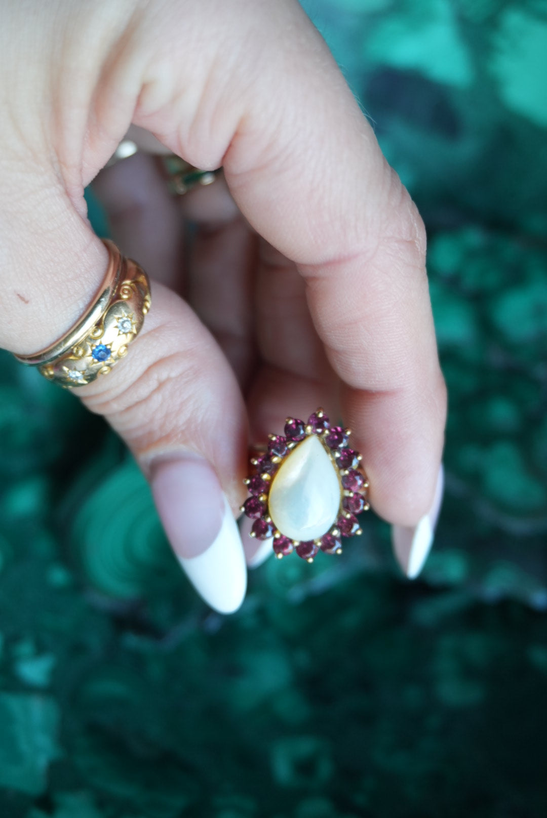Size 5 gold vermeil band with gorgeous pear shape mother of pearl and pink tourmaline halo
