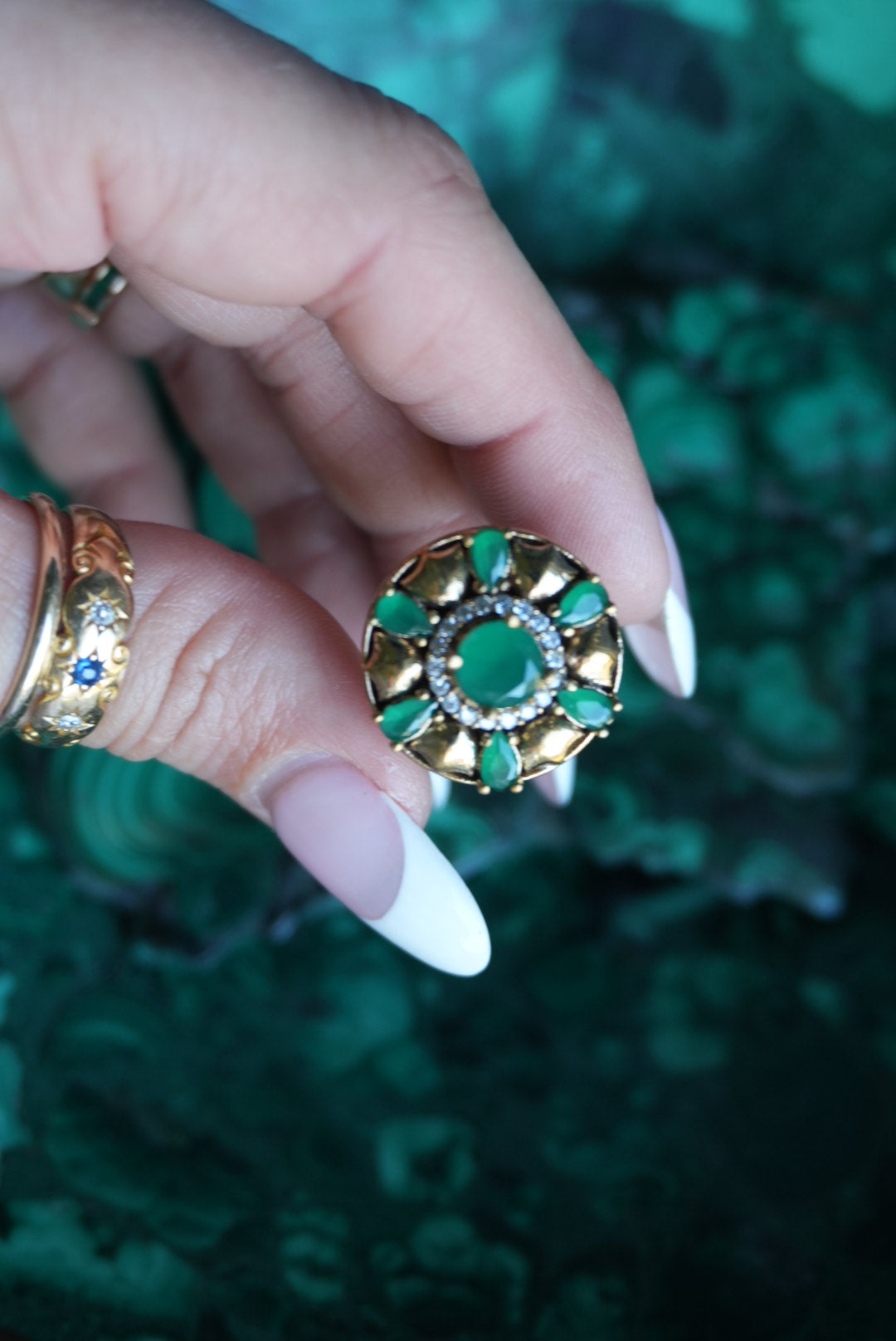 Vermeil & Sterling silver mandala with green glass stones & white topaz stones