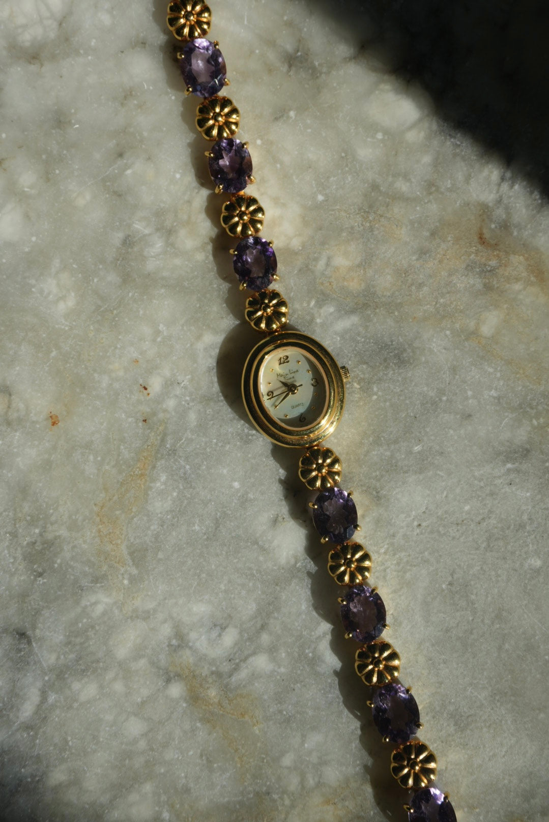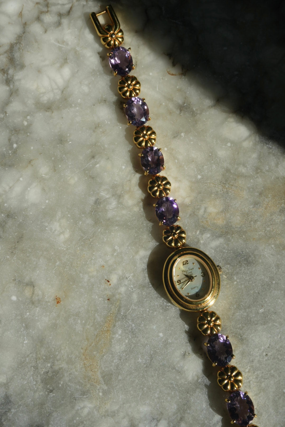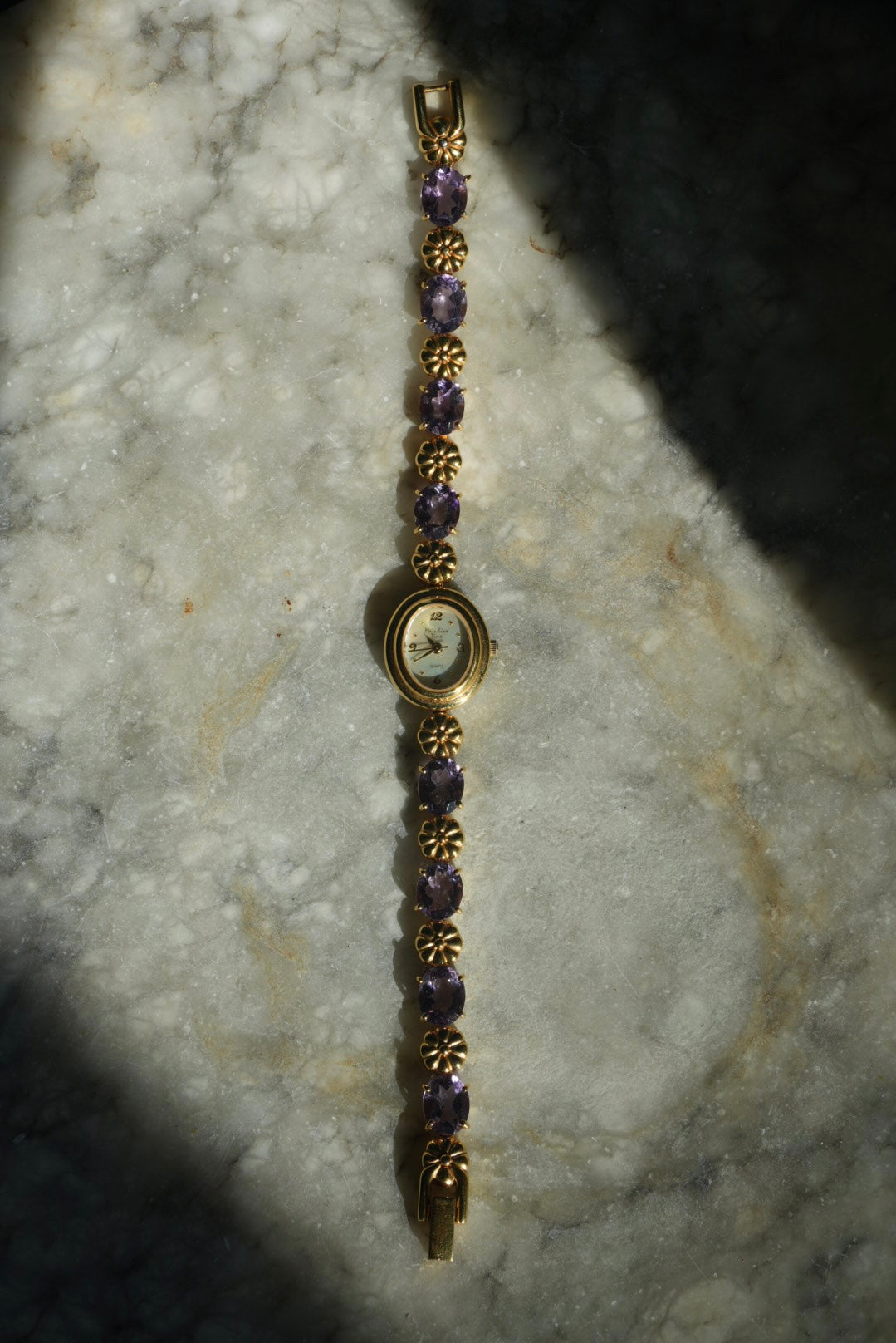 7.75 inch length goldtone watch from Main Line Time with amethyst stones and flower shape links so so so cute !! Watch does NOT function