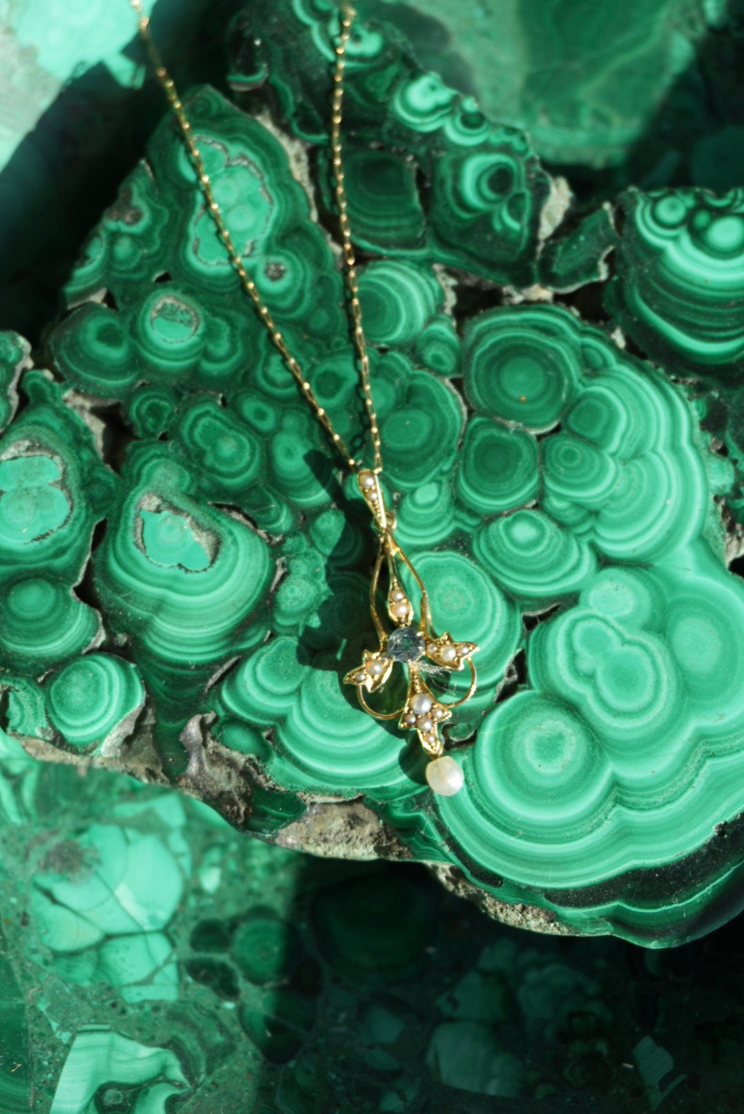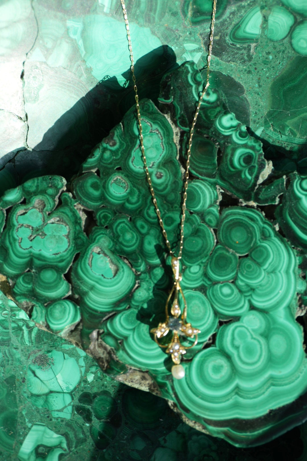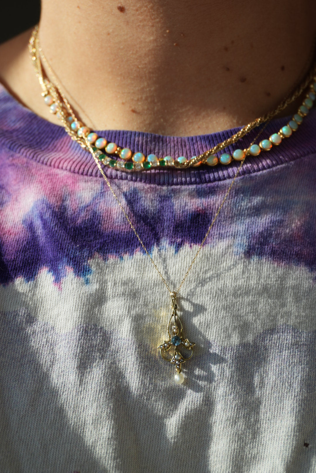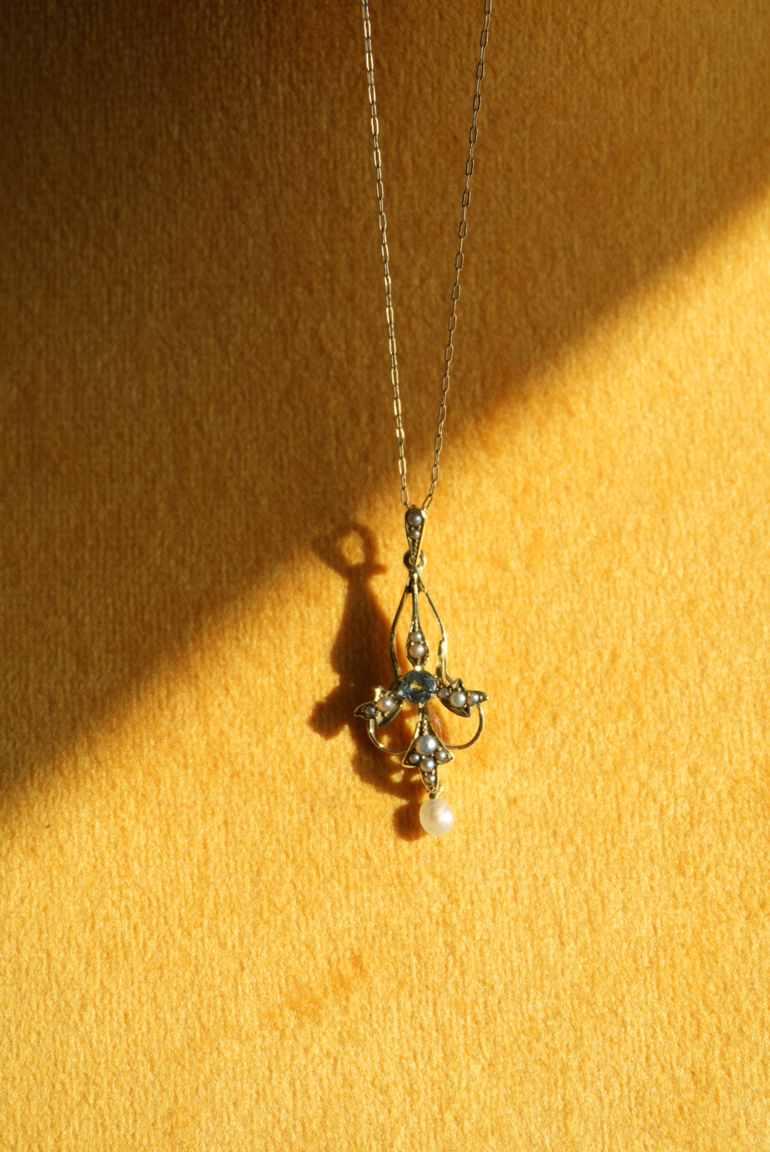 14k gold necklace with blue glass & seed pearls 18 inches long